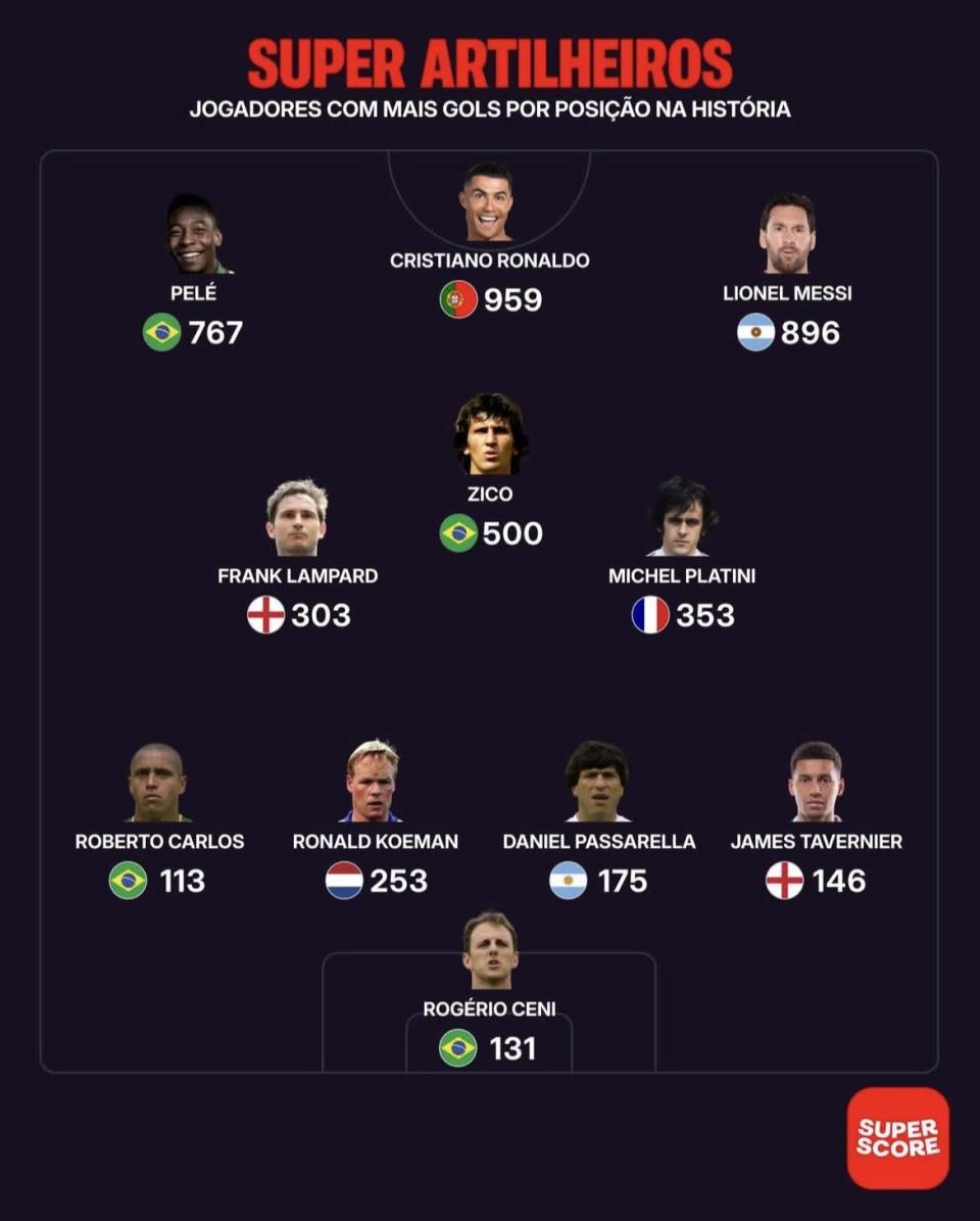 最近Super Score发布了《超级射手:历史各位置进球最多的球员》这份名单。C罗、梅西、贝利、济科、普拉蒂尼、兰帕德这些名字都在里面,光看阵容就已经是“火力堆满”的感觉。可像马拉多纳、克鲁伊夫、范巴斯滕这类同样以进攻闻名的传奇,在这张图里却没出现。只论进攻火力,把这套“各位置最能进球的人”拼在一起,真能算最强进攻阵容吗?最佳阵容门将塞尼 | Rogéri...